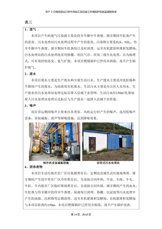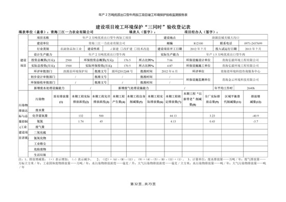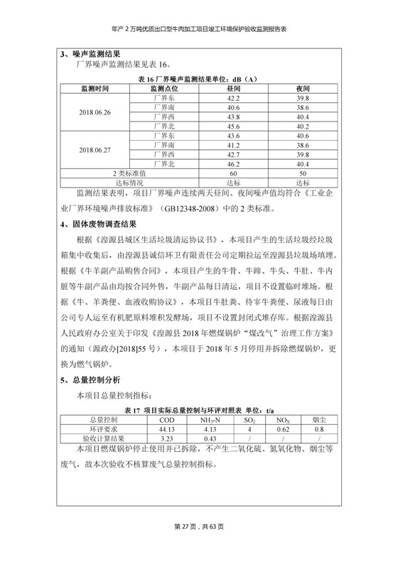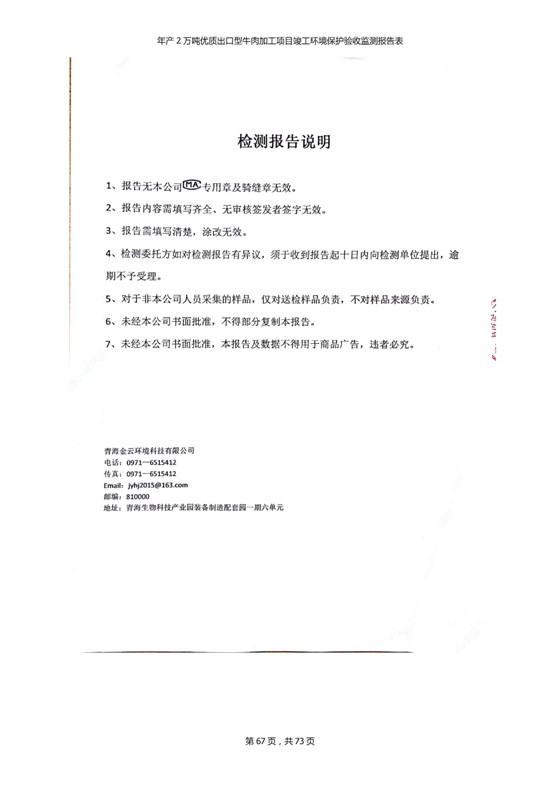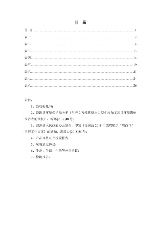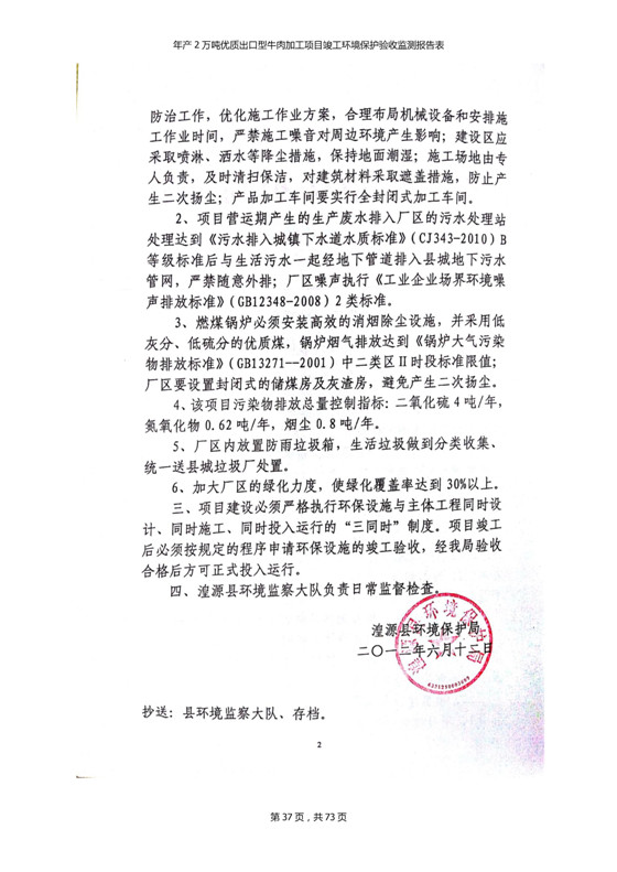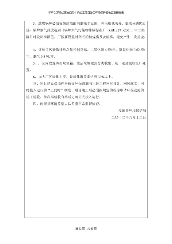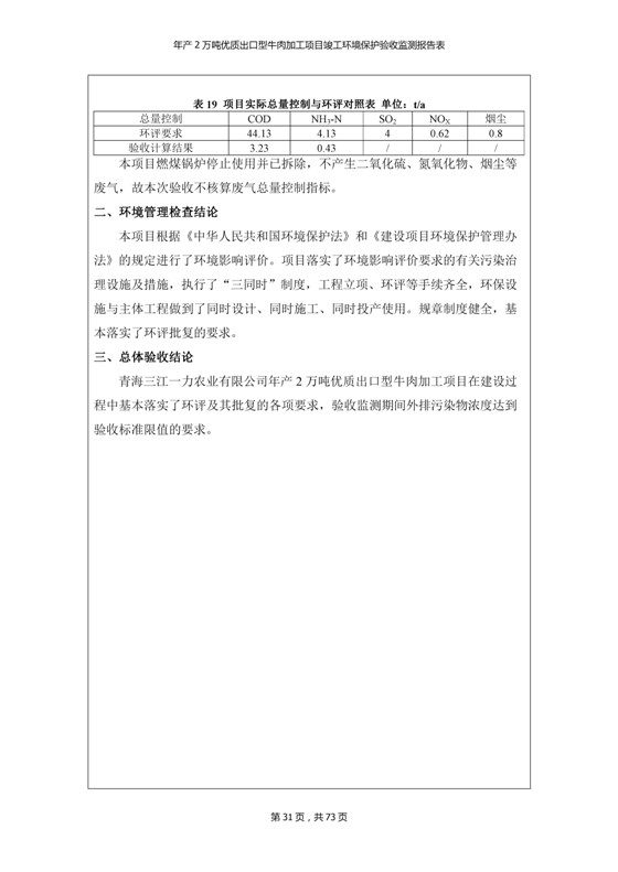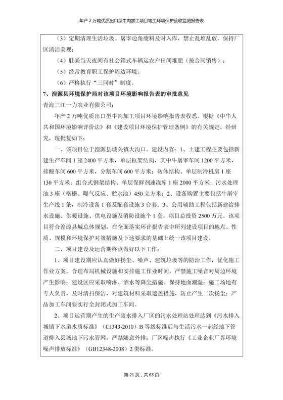 根據(jù)中華人民共和國(guó)國(guó)務(wù)院令第253號(hào)《建設(shè)項(xiàng)目環(huán)境保護(hù)管理?xiàng)l例》(中華人民共和國(guó)國(guó)務(wù)院令第682號(hào)《國(guó)務(wù)院關(guān)于修改〈建設(shè)項(xiàng)目環(huán)境保護(hù)管理?xiàng)l例〉的決定》和《建設(shè)項(xiàng)目竣工環(huán)境保護(hù)驗(yàn)收暫行辦法》,嚴(yán)格依照有關(guān)法律法規(guī),建設(shè)項(xiàng)目環(huán)境保護(hù)設(shè)施驗(yàn)收技術(shù)規(guī)范,本項(xiàng)目環(huán)評(píng)報(bào)告表和環(huán)保審批部門審批意見以及企業(yè)自行驗(yàn)收相關(guān)要求等對(duì)本項(xiàng)目進(jìn)行驗(yàn)收,本項(xiàng)目符合環(huán)保驗(yàn)收條件,可以通過(guò)環(huán)保驗(yàn)收。 青海三江一力農(nóng)業(yè)有限公司組織召開年產(chǎn)2萬(wàn)噸優(yōu)質(zhì)出口型牛肉加工項(xiàng)目(一期工程)驗(yàn)收組意見.