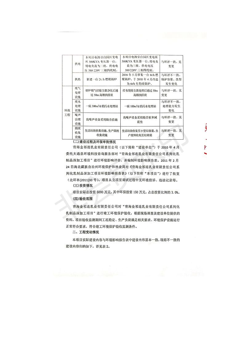 根據(jù)中華人民共和國國務(wù)院令第682號(hào)《國務(wù)院關(guān)于修改〈建設(shè)項(xiàng)目環(huán)境保護(hù)管理?xiàng)l例〉的決定》和《建設(shè)項(xiàng)目竣工環(huán)境保護(hù)驗(yàn)收暫行辦法》(國務(wù)院令682號(hào)),青海金祁連乳業(yè)有限責(zé)任公司系列化乳制品深加工項(xiàng)目(包括竣工環(huán)境保護(hù)驗(yàn)收監(jiān)測(cè)報(bào)告表和驗(yàn)收意見)公示如下。 一、項(xiàng)目名稱:青海金祁連乳業(yè)有限責(zé)任公司系列化乳制品深加工項(xiàng)目 二、地點(diǎn):海北藏族自治州祁連縣冰溝農(nóng)牧產(chǎn)業(yè)化生態(tài)園區(qū) 三、建設(shè)單位:青海金祁連乳業(yè)有限責(zé)任公司 四、建設(shè)內(nèi)容:本項(xiàng)目新征工業(yè)用地40畝,新建生產(chǎn)車間2200 m2、采用多聯(lián)跨鋼結(jié)構(gòu)廠房,跨度為24米,長(zhǎng)度為80米,柱間距為6米,標(biāo)高為4.8米。廠房?jī)?nèi)部根據(jù)產(chǎn)品生產(chǎn)工藝及工序要求分為不同的工作區(qū)域和車間辦公室。建設(shè)有保鮮冷庫800 m2、普通倉庫500m2、污水處理站房160 m2、鍋爐房和配電室159 m2、綜合辦公樓1200 m2、職工食堂和宿舍500 m2、其他輔助用房35 m2、蓄水池100 m2以及與土建工程相關(guān)聯(lián)的水、電、熱官網(wǎng)等輔助設(shè)施。 五、聯(lián)系人:張工 六、聯(lián)系電 話:0971-6515411 七、公示時(shí)間:二〇一九年七月十日至二〇一九年八月六日 公示期間,對(duì)上述公示內(nèi)容如有異議,請(qǐng)以書面形式反饋,個(gè)人須署真實(shí)姓名,單位須加蓋公章。