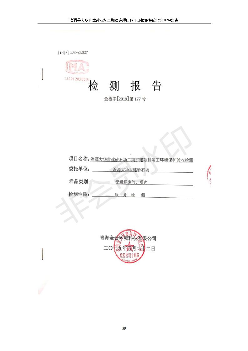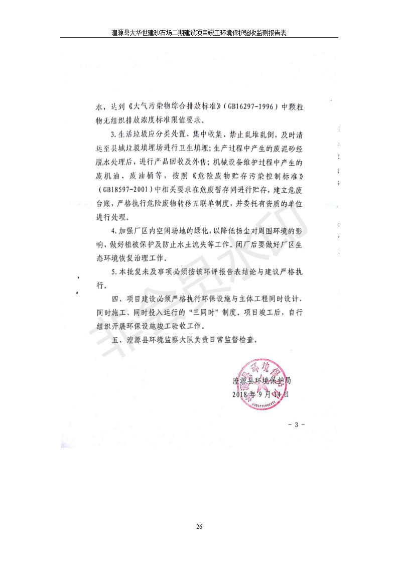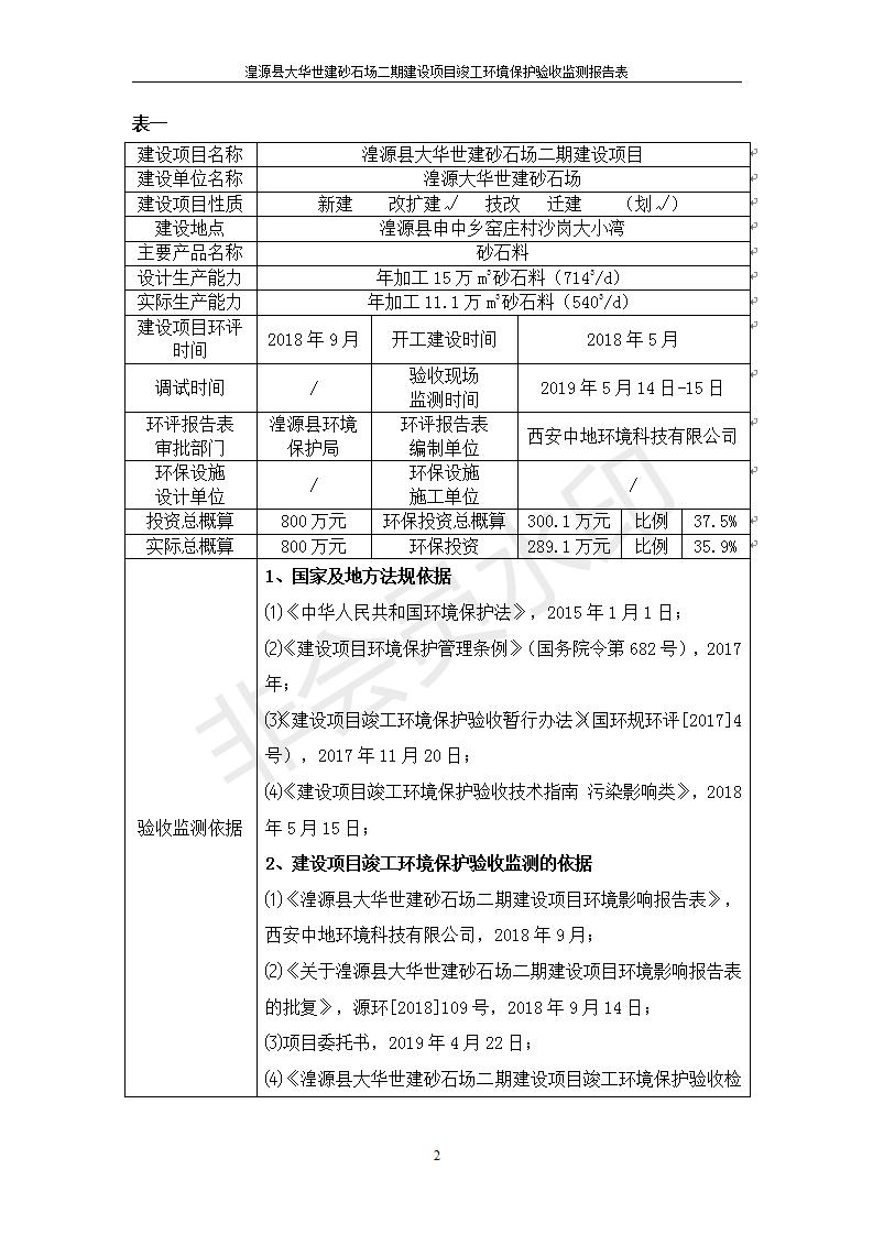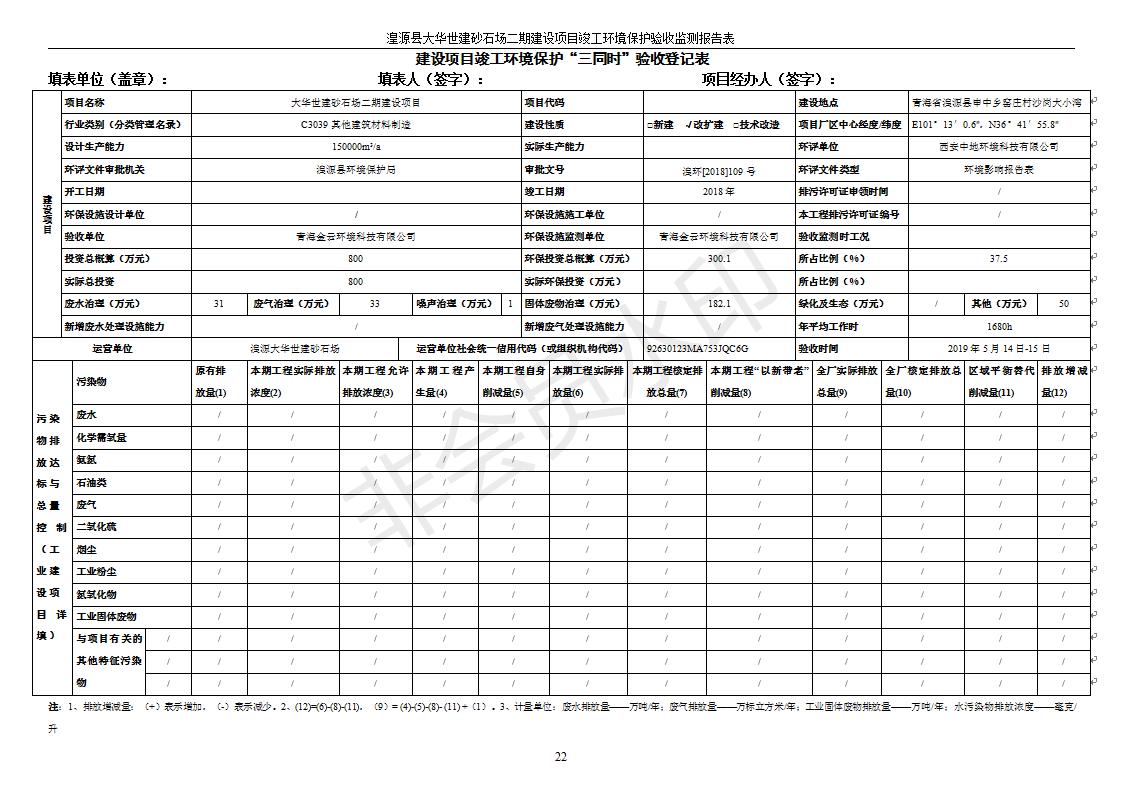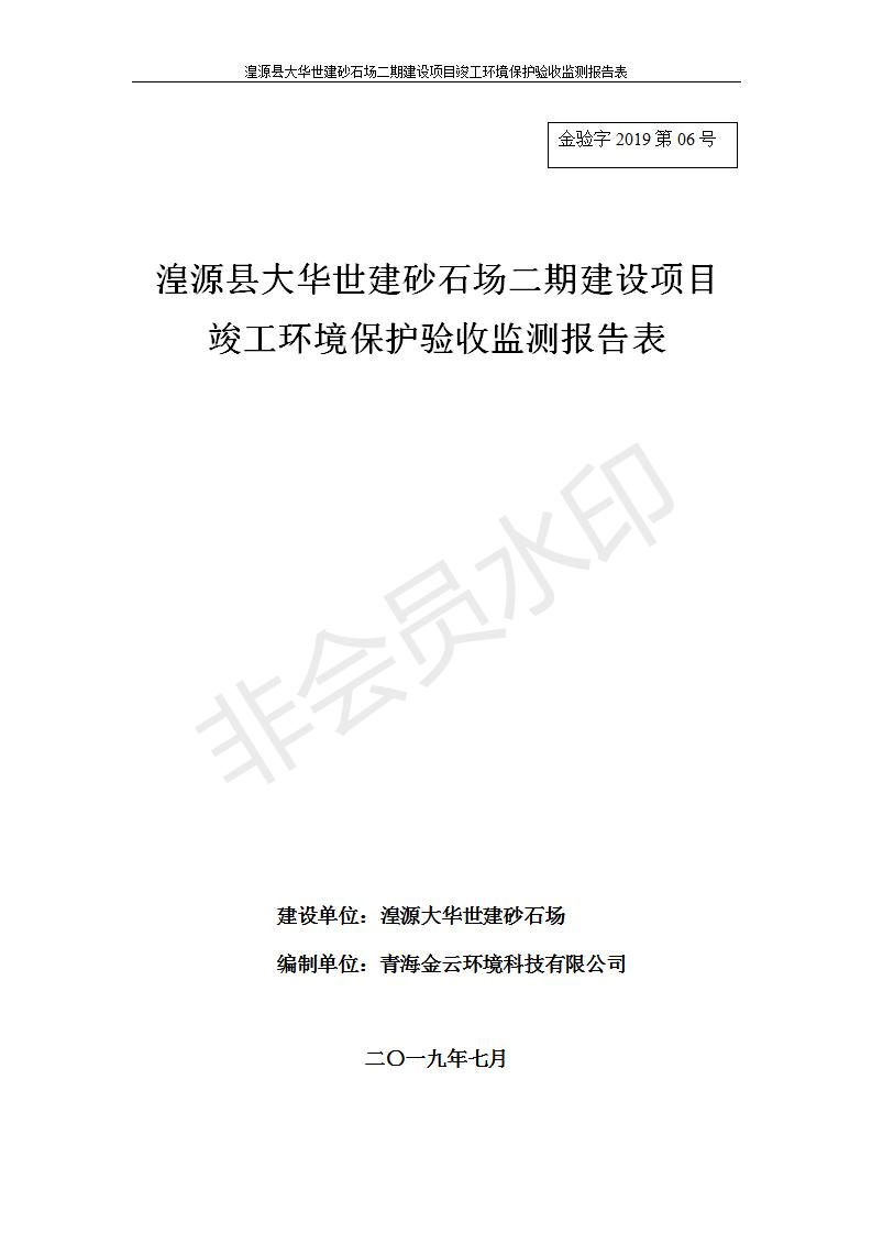 根據(jù)中華人民共和國(guó)國(guó)務(wù)院令第682號(hào)《國(guó)務(wù)院關(guān)于修改〈建設(shè)項(xiàng)目環(huán)境保護(hù)管理?xiàng)l例〉的決定》和《建設(shè)項(xiàng)目竣工環(huán)境保護(hù)驗(yàn)收暫行辦法》(國(guó)務(wù)院令682號(hào)),湟源大華世建砂石場(chǎng)湟源縣大華世建砂石場(chǎng)二期建設(shè)項(xiàng)目(包括竣工環(huán)境保護(hù)驗(yàn)收監(jiān)測(cè)報(bào)告表和驗(yàn)收意見)公示如下。 一、項(xiàng)目名稱:湟源縣大華世建砂石場(chǎng)二期建設(shè)項(xiàng)目 二、地點(diǎn):湟源縣申中鄉(xiāng)窯莊村沙崗大小灣 三、建設(shè)單位:湟源大華世建砂石場(chǎng) 四、建設(shè)內(nèi)容:項(xiàng)目主要建設(shè)砂石料產(chǎn)品加工生產(chǎn)區(qū)、原料堆場(chǎng)、產(chǎn)品堆場(chǎng)、辦公區(qū)等。五、聯(lián)系人:張工 六、聯(lián)系電 話:0971-6515411 七、公示時(shí)間:二〇一九年七月二十五日至二〇一九年八月二十一日公示期間,對(duì)上述公示內(nèi)容如有異議,請(qǐng)以書面形式反饋,個(gè)人須署真實(shí)姓名,單位須加蓋公章。
