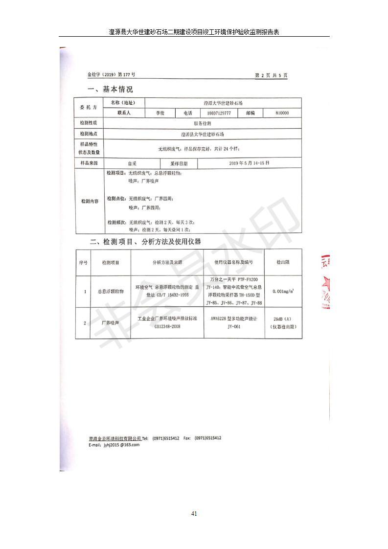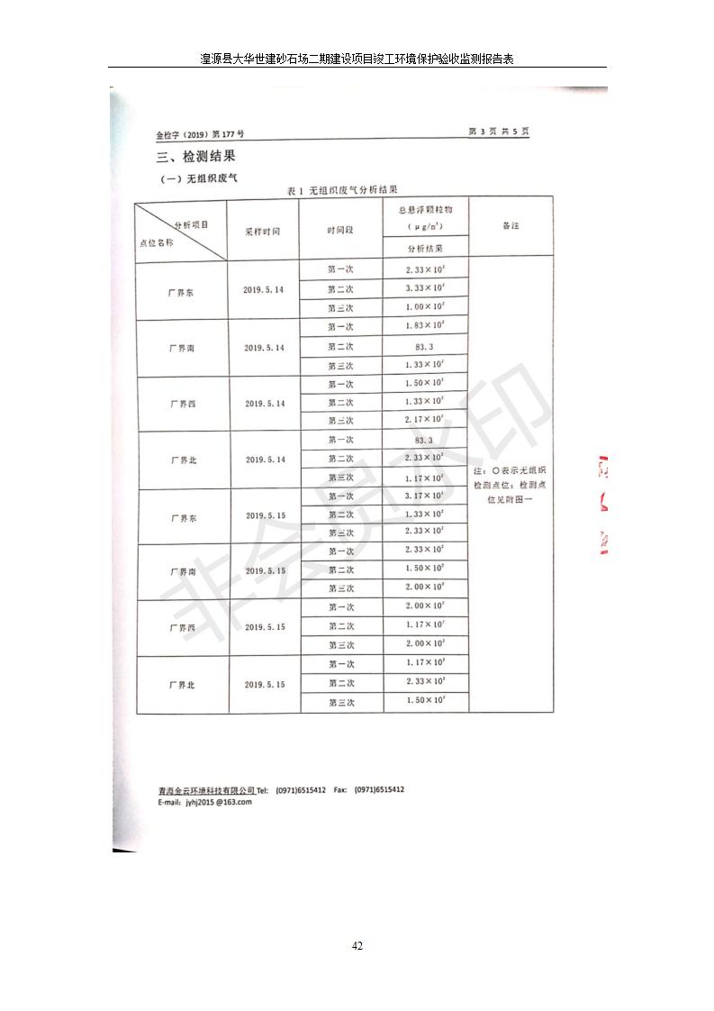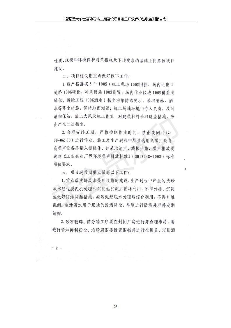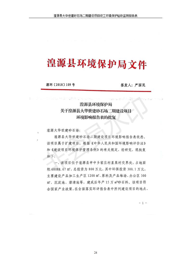 根據(jù)中華人民共和國(guó)國(guó)務(wù)院令第682號(hào)《國(guó)務(wù)院關(guān)于修改〈建設(shè)項(xiàng)目環(huán)境保護(hù)管理?xiàng)l例〉的決定》和《建設(shè)項(xiàng)目竣工環(huán)境保護(hù)驗(yàn)收暫行辦法》(國(guó)務(wù)院令682號(hào)),湟源大華世建砂石場(chǎng)湟源縣大華世建砂石場(chǎng)二期建設(shè)項(xiàng)目(包括竣工環(huán)境保護(hù)驗(yàn)收監(jiān)測(cè)報(bào)告表和驗(yàn)收意見)公示如下。 一、項(xiàng)目名稱:湟源縣大華世建砂石場(chǎng)二期建設(shè)項(xiàng)目 二、地點(diǎn):湟源縣申中鄉(xiāng)窯莊村沙崗大小灣 三、建設(shè)單位:湟源大華世建砂石場(chǎng) 四、建設(shè)內(nèi)容:項(xiàng)目主要建設(shè)砂石料產(chǎn)品加工生產(chǎn)區(qū)、原料堆場(chǎng)、產(chǎn)品堆場(chǎng)、辦公區(qū)等。五、聯(lián)系人:張工 六、聯(lián)系電 話:0971-6515411 七、公示時(shí)間:二〇一九年七月二十五日至二〇一九年八月二十一日公示期間,對(duì)上述公示內(nèi)容如有異議,請(qǐng)以書面形式反饋,個(gè)人須署真實(shí)姓名,單位須加蓋公章。