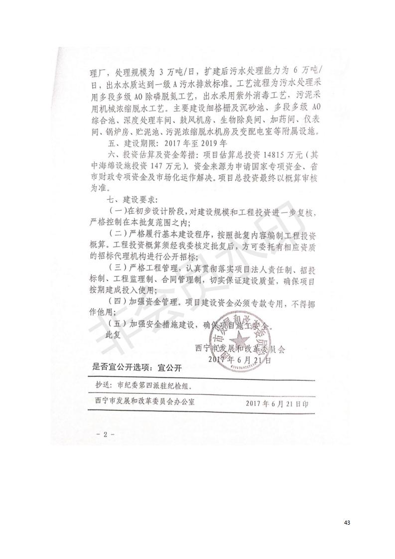 根據(jù)中華人民共和國(guó)國(guó)務(wù)院令第682號(hào)《國(guó)務(wù)院關(guān)于修改〈建設(shè)項(xiàng)目環(huán)境保護(hù)管理?xiàng)l例〉的決定》和《建設(shè)項(xiàng)目竣工環(huán)境保護(hù)驗(yàn)收暫行辦法》(國(guó)務(wù)院令682號(hào)),西寧市第四污水處理廠擴(kuò)建工程建設(shè)項(xiàng)目(包括竣工環(huán)境保護(hù)驗(yàn)收監(jiān)測(cè)報(bào)告表和驗(yàn)收意見)公示如下。 一、項(xiàng)目名稱:西寧市第四污水處理廠擴(kuò)建工程建設(shè)項(xiàng)目 二、地點(diǎn):五四西路南側(cè),原西寧市第四污水處理廠西側(cè)用地 三、建設(shè)單位:西寧市排水開發(fā)建設(shè)有限公司 四、建設(shè)內(nèi)容:第四污水處理廠擴(kuò)建工程五、聯(lián)系人:張工 六、聯(lián)系電 話:0971-6515411 七、公示時(shí)間:二〇一九年九月十七日至二〇一九年十月十八日公示期間,對(duì)上述公示內(nèi)容如有異議,請(qǐng)以書面形式反饋,個(gè)人須署真實(shí)姓名,單位須加蓋公章。