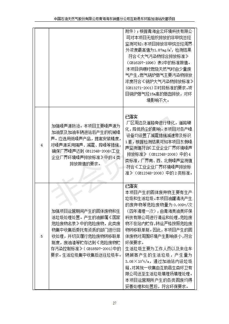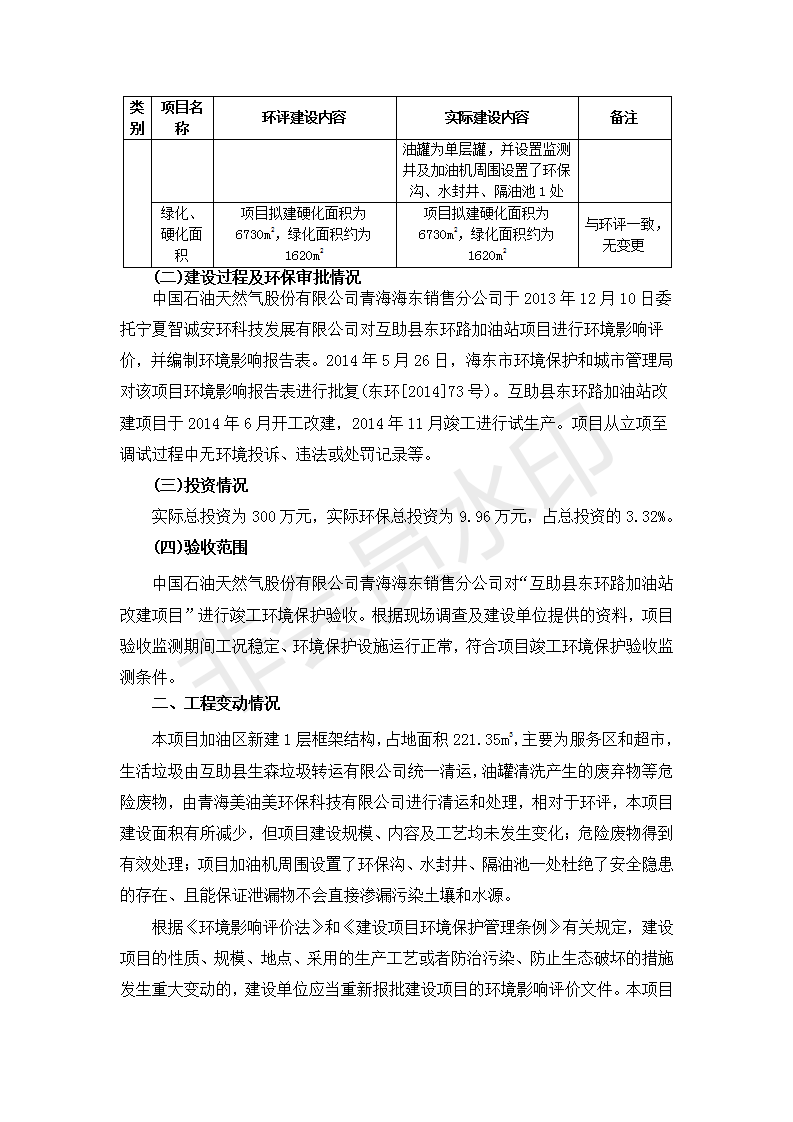 根據(jù)中華人民共和國國務院令第682號《國務院關于修改〈建設項目環(huán)境保護管理條例〉的決定》和《建設項目竣工環(huán)境保護驗收暫行辦法》(國務院令682號),互助縣東環(huán)路加油站改建項目(包括竣工環(huán)境保護驗收監(jiān)測報告表和驗收意見)公示如下。 一、項目名稱:互助縣東環(huán)路加油站改建項目 二、地點:青海省海東市互助縣東環(huán)路 六、聯(lián)系電話:0971-6515411 七、公示時間:二〇一九年九月二十七日至二〇一九年十月二十九日 公示期間,對上述公示內(nèi)容如有異議,請以書面形式反饋,個人須署真實姓名,單位須加蓋公章。