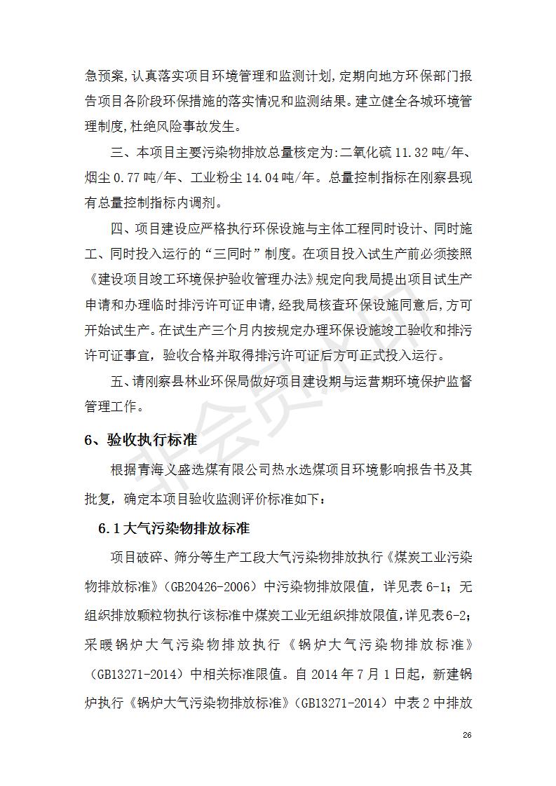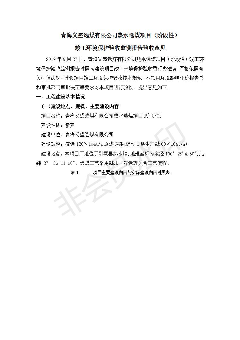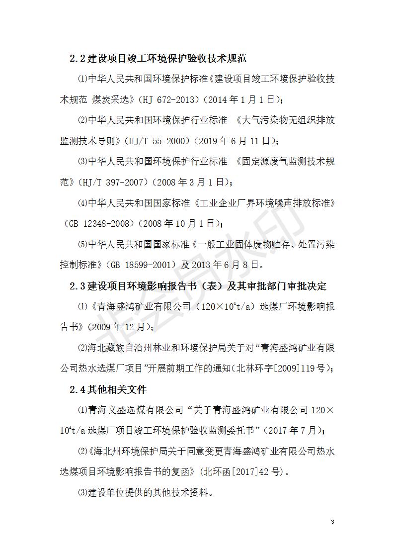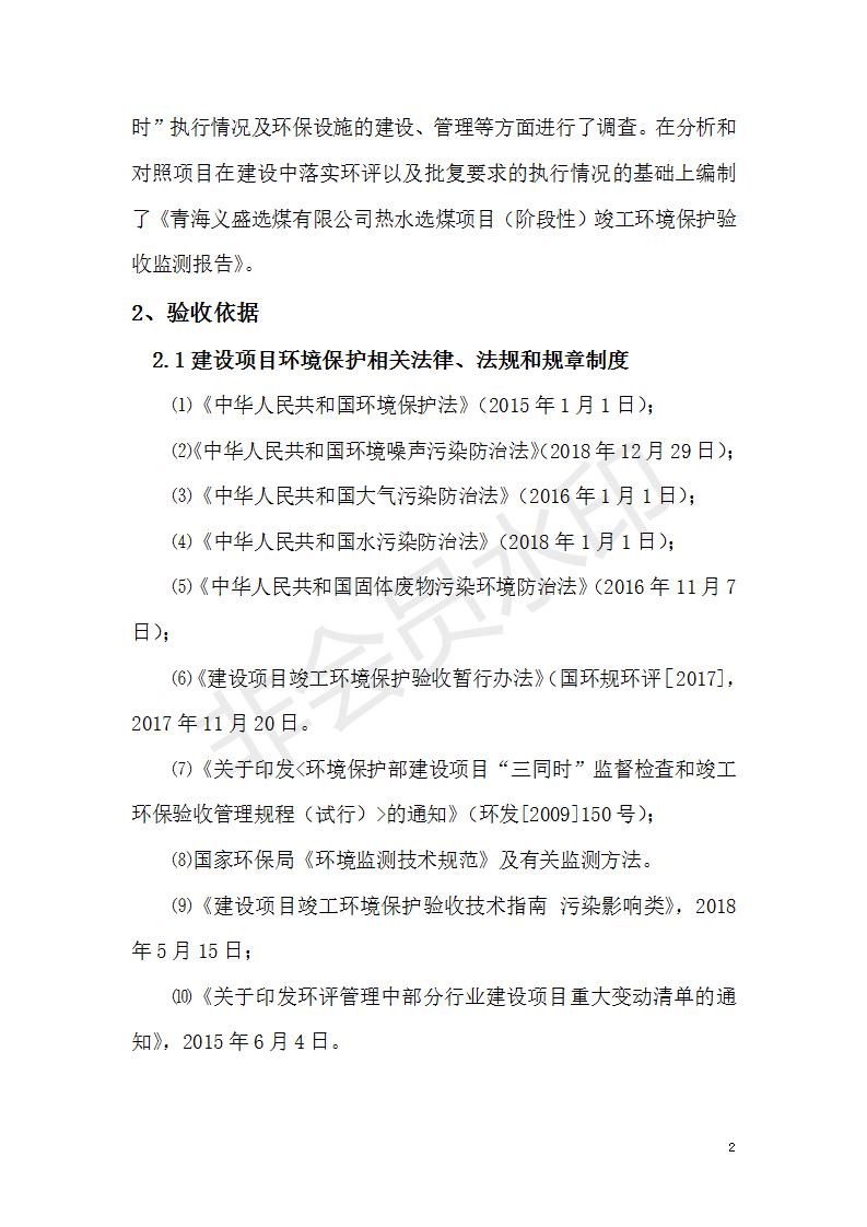 根據(jù)中華人民共和國國務(wù)院令第682號《國務(wù)院關(guān)于修改〈建設(shè)項(xiàng)目環(huán)境保護(hù)管理?xiàng)l例〉的決定》和《建設(shè)項(xiàng)目竣工環(huán)境保護(hù)驗(yàn)收暫行辦法》(國務(wù)院令682號),青海義盛選煤有限公司熱水選煤項(xiàng)目(階段性)竣工環(huán)境保護(hù)驗(yàn)收監(jiān)測報告(包括竣工環(huán)境保護(hù)驗(yàn)收監(jiān)測報告和驗(yàn)收意見)公示如下。 一、項(xiàng)目名稱:青海義盛選煤有限公司熱水選煤項(xiàng)目(階段性) 二、地點(diǎn):剛察縣熱水鎮(zhèn) 此外還包括公用工程系統(tǒng)、消防系統(tǒng)及輔助生產(chǎn)設(shè)施等。 五、聯(lián)系人:張工六、聯(lián)系電話:0971-6515411 七、公示時間:二〇一九年十一月十二日至二〇一九年十二月九日