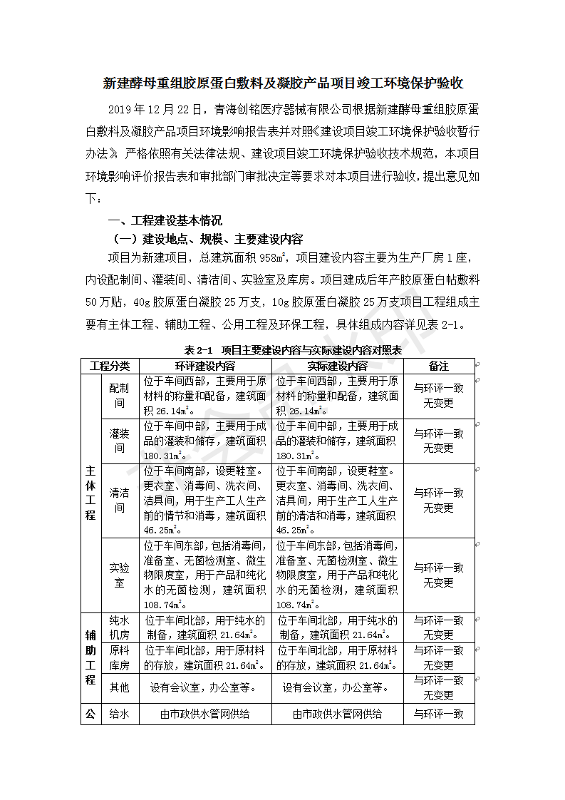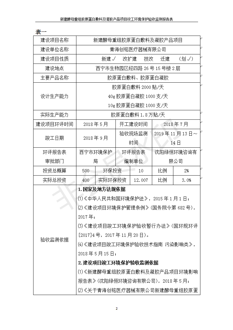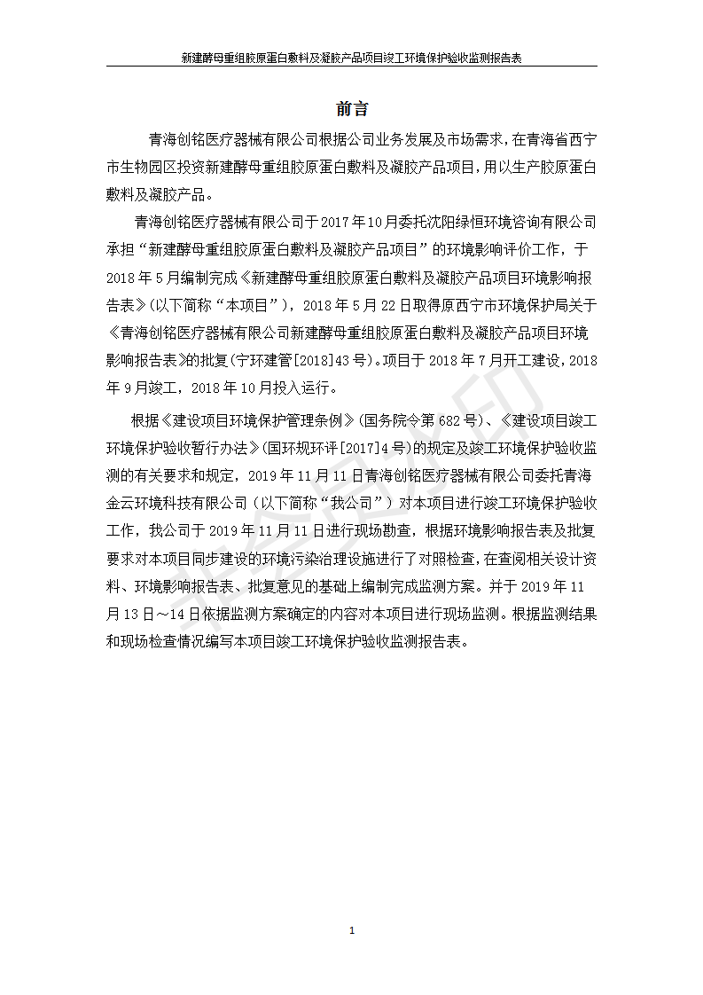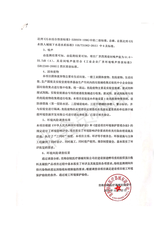 根據(jù)中華人民共和國國務(wù)院令第682號《國務(wù)院關(guān)于修改〈建設(shè)項(xiàng)目環(huán)境保護(hù)管理?xiàng)l例〉的決定》和《建設(shè)項(xiàng)目竣工環(huán)境保護(hù)驗(yàn)收暫行辦法》(國務(wù)院令682號),新建酵母重組膠原蛋白敷料及凝膠產(chǎn)品項(xiàng)目(包括竣工環(huán)境保護(hù)驗(yàn)收監(jiān)測報(bào)告表和驗(yàn)收意見)公示如下。 一、項(xiàng)目名稱:新建酵母重組膠原蛋白敷料及凝膠產(chǎn)品項(xiàng)目 二、地點(diǎn):西寧市生物園區(qū)經(jīng)四路26號15號樓2層 五、聯(lián)系人:董繼風(fēng) 六、聯(lián)系電話:18606125050 七、公示時(shí)間:二〇二〇年一月十三日至二〇二〇年二月十二日 公示期間,對上述公示內(nèi)容如有異議,請以書面形式反饋,個(gè)人須署真實(shí)姓名,單位須加蓋公章。